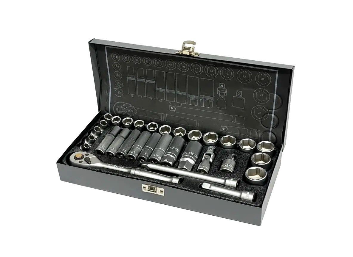 لغلغه، کشویی و تبدیل: این جعبه بکس دارای یک لغلغه درایو 3/8، یک کشویی درایو 3/8 و یک تبدیل از درایو 3/8 به درایو 1/4 است که برای افزایش قابلیت استفاده از بکس ها